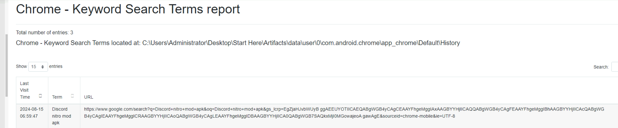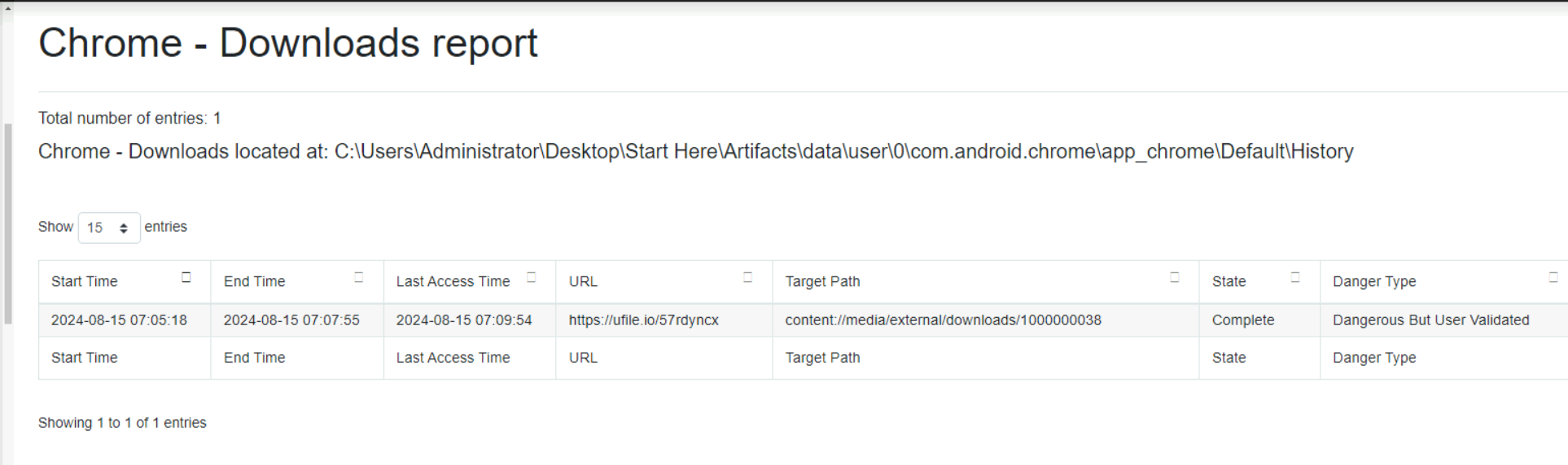ALEAPP (Android Logs Events And Protobuf Parser) is used to build a structured report from the Android dump. This gives a quick overview of browser history, downloads, installed apps, and device activity without manually digging through raw files.