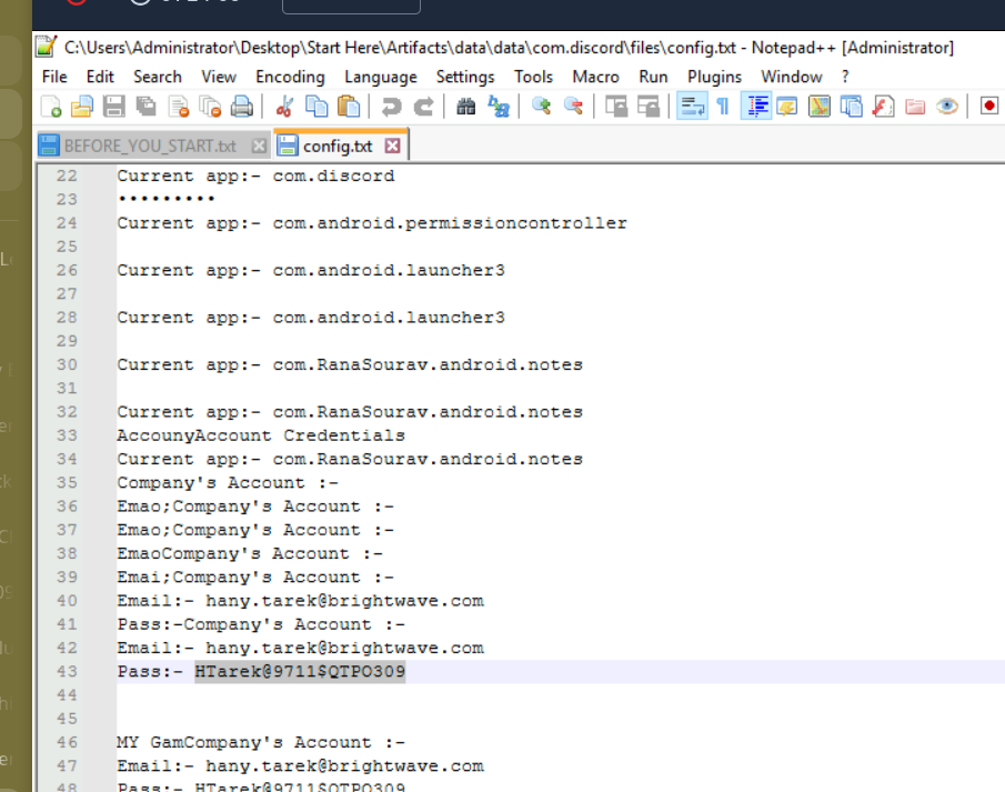 An employee at BrightWave Company compromised the organisation’s security through poor personal security hygiene — storing credentials in a phone notes app and downloading APK files from untrusted sources. An attacker exploited these habits to steal credentials and exfiltrate sensitive data. An Android dump from the employee’s device has been provided for analysis.