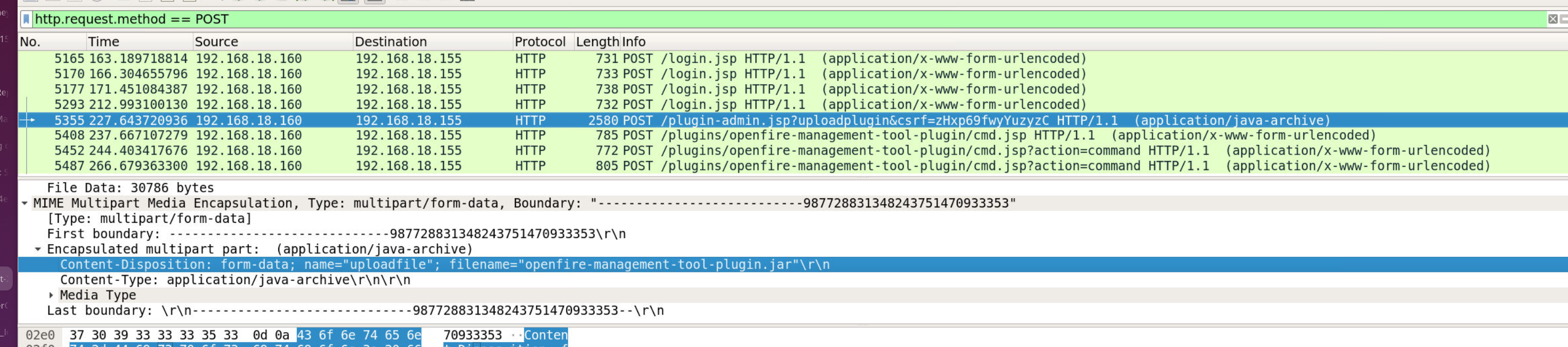 The most critical step in the chain is the upload of a malicious Openfire plugin. Openfire supports JAR-based plugins that extend server functionality — the attacker abused this legitimate feature to deploy a remote management tool.