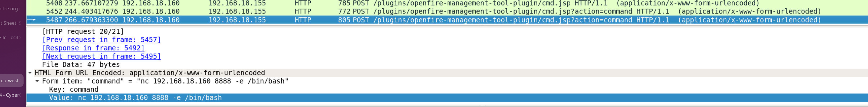 The -e /bin/bash flag binds a bash shell to the connection, giving the attacker a fully interactive shell session on the Openfire server.