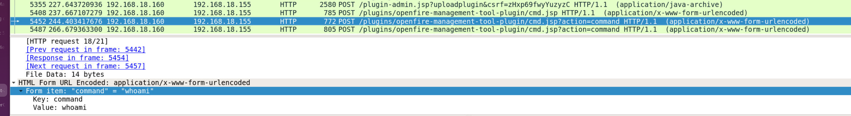 With the plugin active, the attacker used it to execute commands on the server. The first command sent was: