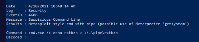 Shortly after, DeepBlueCLI flags likely Meterpreter activity at 4/10/2021 10:48:14 — Meterpreter leaves characteristic signatures in Windows event logs through its process injection and named pipe communication patterns.