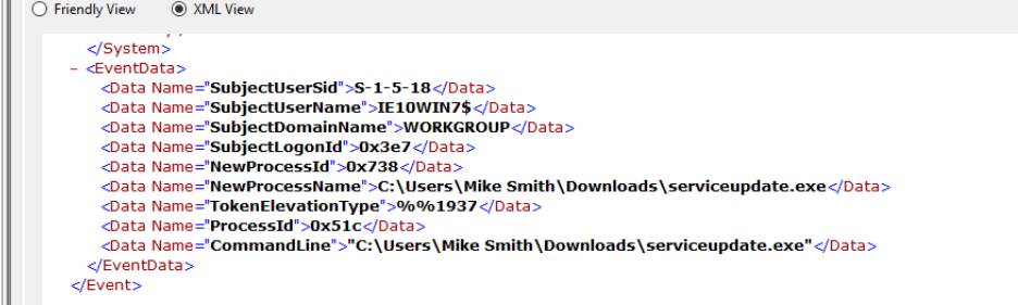 Downloads\serviceupdate.exe was executed by Mike Smith — the malicious executable that established the Meterpreter reverse shell. The Downloads directory and generic service-themed name are both red flags, confirming this as the payload delivered post-RDP compromise.