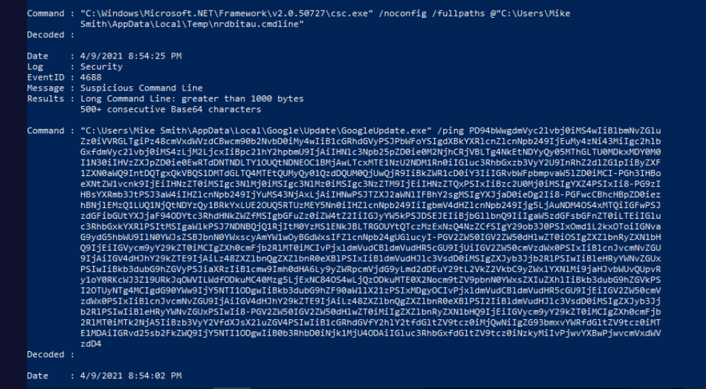 The output immediately surfaces Mike Smith as the account that executed GoogleUpdate.exe — a common masquerading technique where malware adopts legitimate-sounding names to blend in with normal system activity.