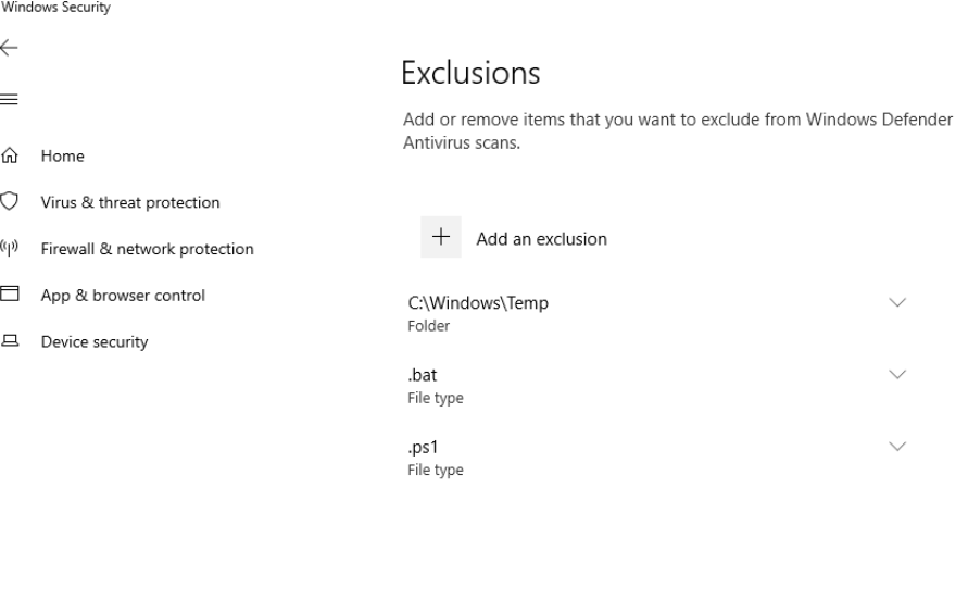 Two extensions are excluded from scanning — .bat and .ps1. Both are scripting extensions commonly abused by attackers, making their exclusion a significant defensive gap. An attacker who can add these exclusions can drop and execute malicious scripts without triggering Defender.