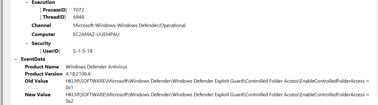 | Defense Evasion | Controlled Folder Access downgraded from Enabled to AuditMode |