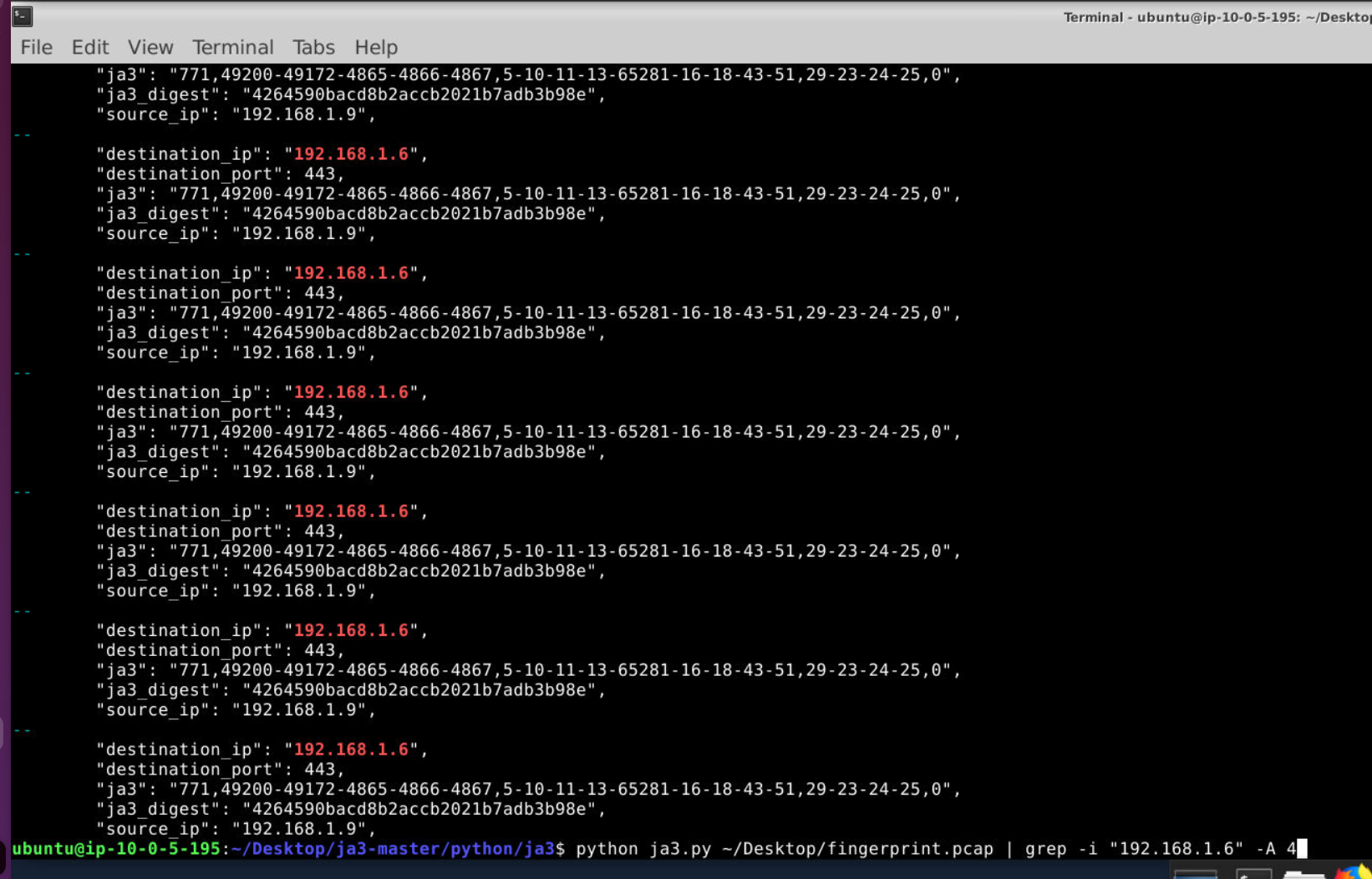JA3 fingerprinting extracts TLS ClientHello parameters (cipher suites, TLS version, extensions, elliptic curves) from the PCAP and produces an MD5 digest that uniquely identifies the TLS client implementation. This is valuable for threat hunting — the same malware will produce the same JA3 hash regardless of destination IP or domain.