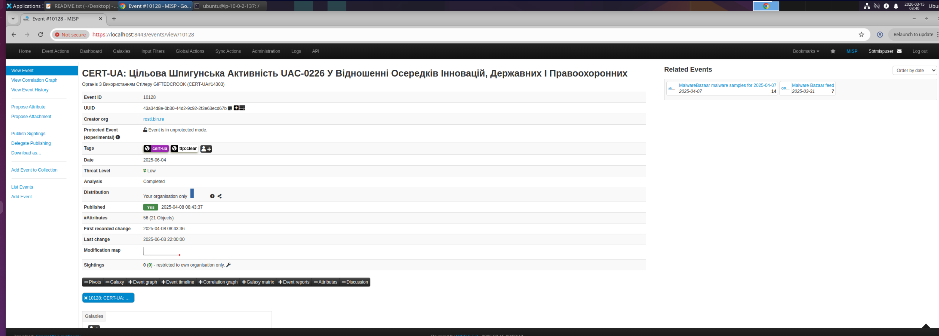 This event was published by CERT-UA — the Computer Emergency Response Team of Ukraine — and ingested into the MISP instance via rcsti.bin.re. The campaign targets Ukrainian innovation hubs, government bodies, and law enforcement agencies using a stealer malware strain tracked as GIFTEDCROOK, attributed to threat actor cluster UAC-0226.