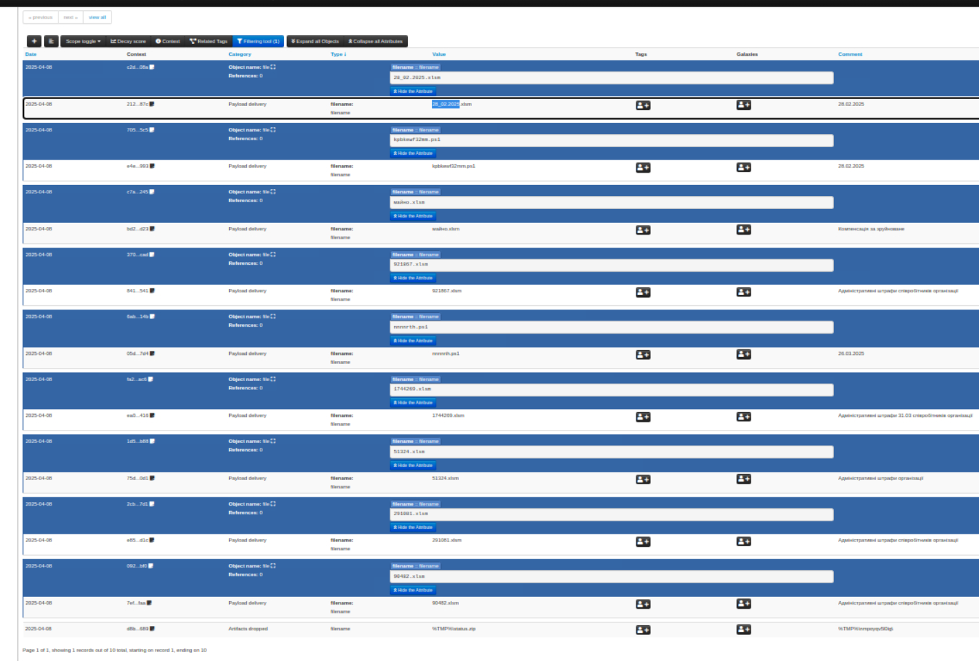 Nine macro-enabled Excel workbooks (.xlsm) were identified across the event attributes. These files are used as phishing lures themed around administrative fines and government notifications — a social engineering technique consistent with UAC-0226’s documented TTPs targeting Ukrainian public sector employees. Filenames include numeric identifiers and Cyrillic-named variants such as майно.xlsm (property) suggesting localised targeting.
