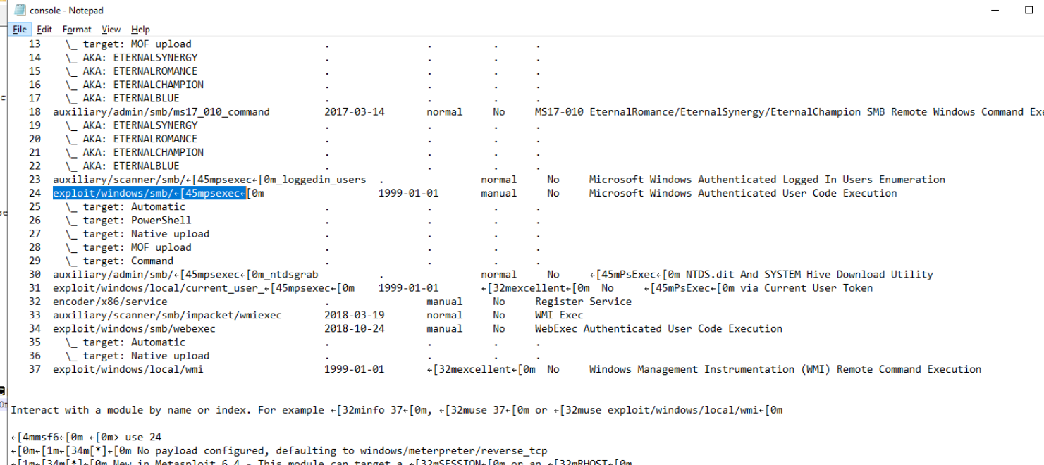 With valid credentials for milton-waddams, Brett moved to Metasploit. The screenshot insider_msconsole_24.png shows use 24 in msfconsole — module index 24 corresponds to: