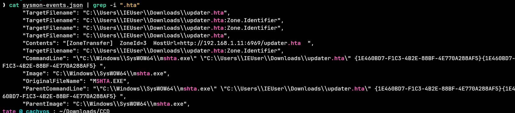 The first thing to check is how the attacker got in. Grepping the Sysmon logs for .hta files points straight to the entry: