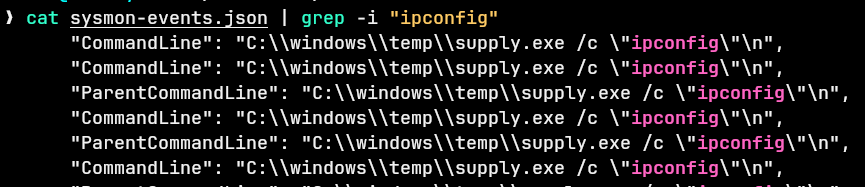 With supply.exe running as the fake COMSPEC, the malware starts executing commands. The first one observed is a basic recon command: