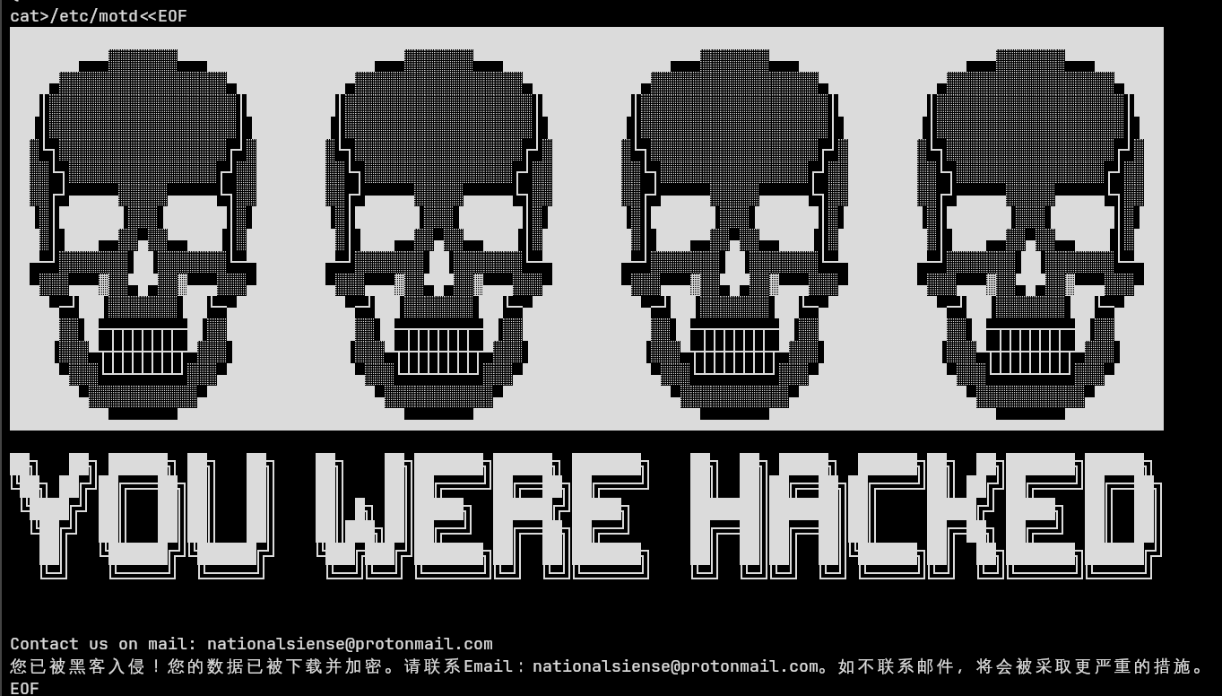 | Defacement | /etc/motd overwritten with ransom demand |