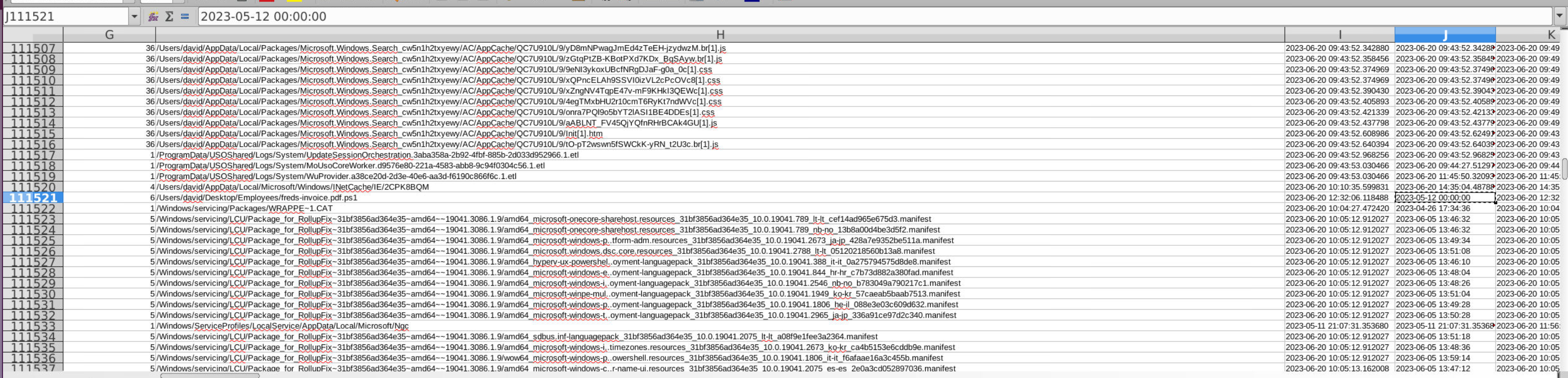 Another double extension — freds-invoice.pdf.ps1 is a PowerShell script disguised as a PDF invoice. This is almost certainly the initial phishing lure that David downloaded and “nothing happened” — because the PS1 extension wasn’t associated with a visible execution in Windows Explorer if the user was viewing it as a PDF. The filename freds-invoice provides plausible business context for David in an HR role.