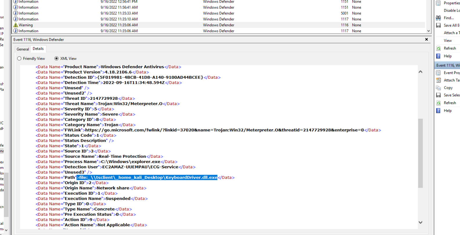 9/16/2022 11:35 AMTrojan:Win32/Meterpreter.Ofile: \\tsclient\_home_kali_Desktop\KeyboardDriver.dll.exeThe path \\tsclient\ is the RDP client drive redirection mapping — the attacker executed KeyboardDriver.dll.exe directly from the Kali machine’s Desktop over the RDP session rather than copying it to disk first. Defender detected it via real-time protection and suspended execution. The _home_kali_Desktop path confirms the Kali home directory was mapped through the RDP session.