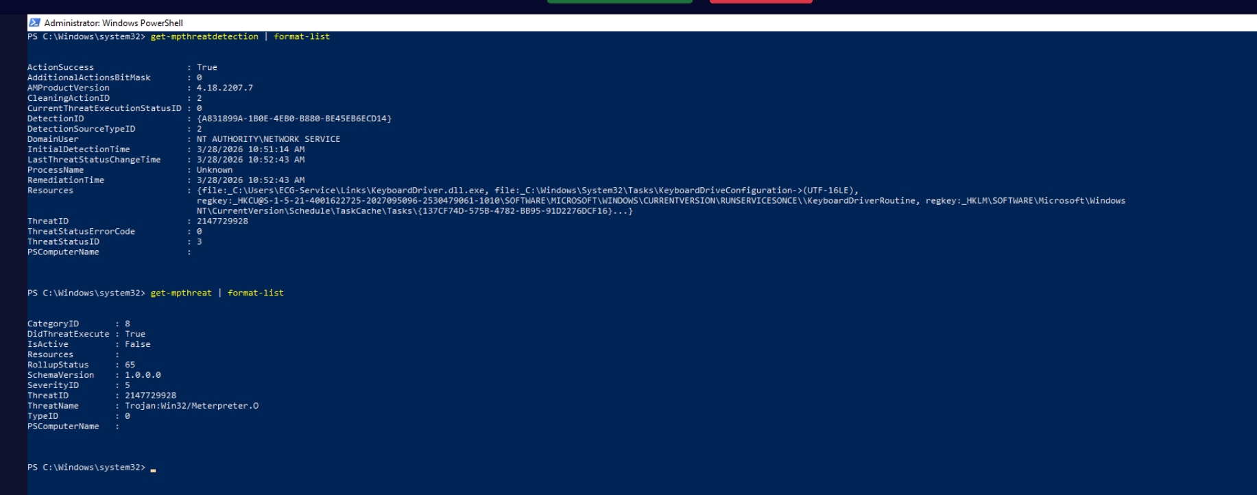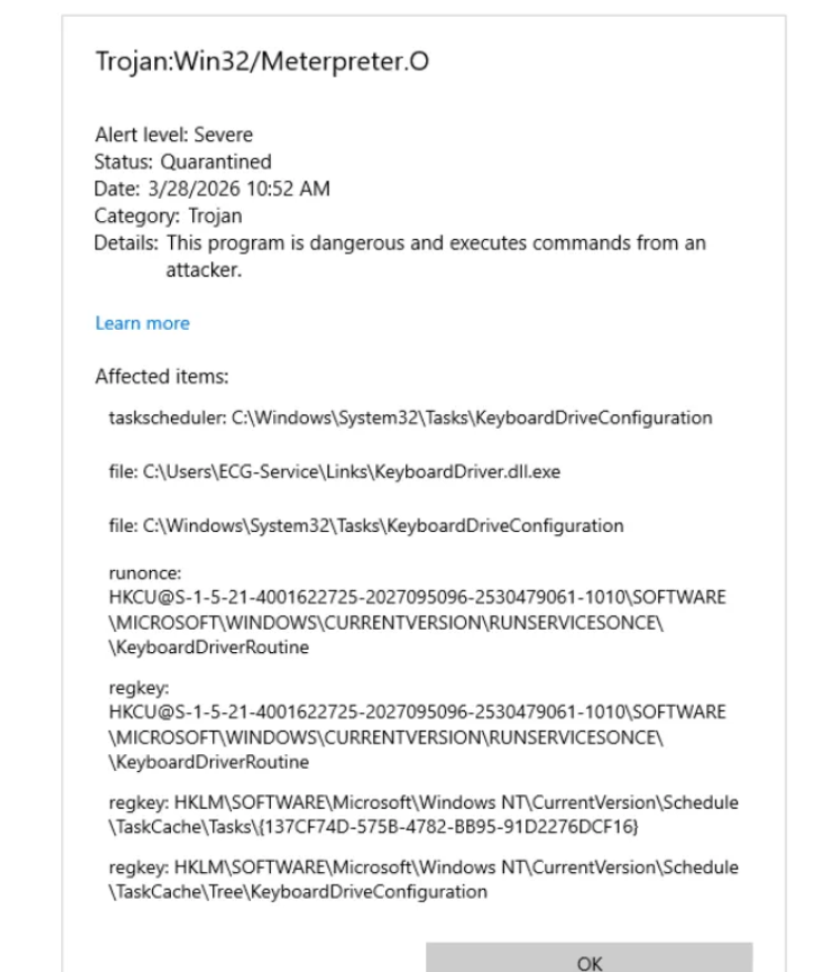 | Defender Detection | Trojan:Win32/Meterpreter.O detected and quarantined at 11:35 AM |