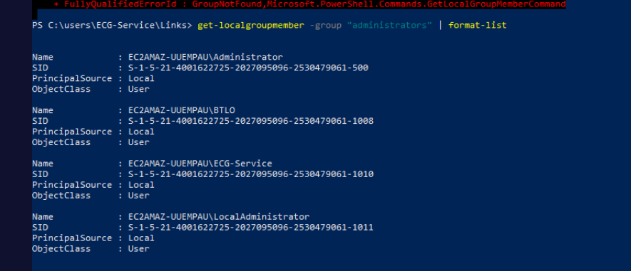 LocalAdministrator was added to three groups: Administrators, Remote Desktop Users, and Users — full local admin rights plus RDP access, providing a durable backdoor account independent of the compromised ECG-Service account.