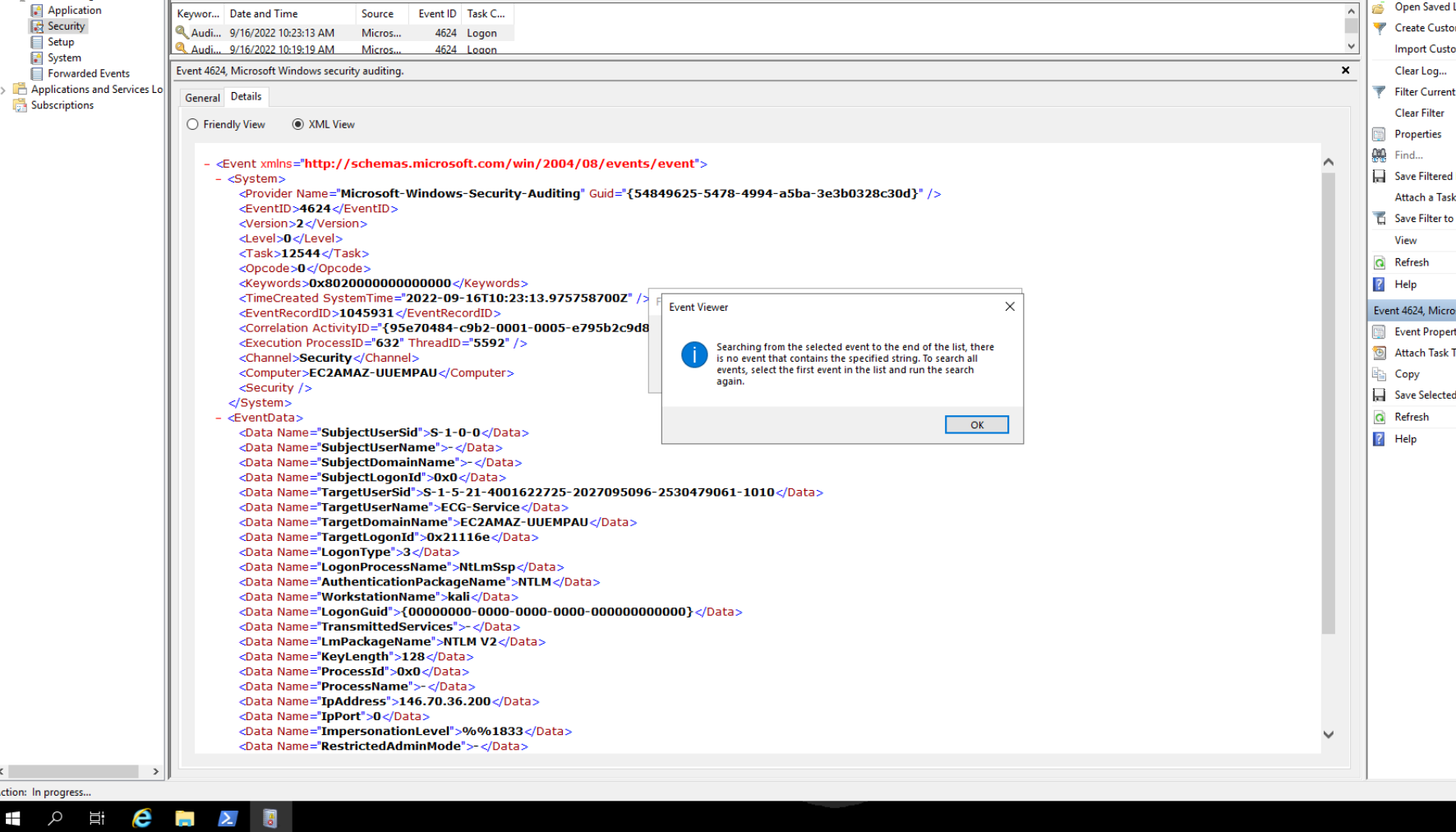 Ranking source IPs across the failed logon events surfaces the attacker: 146.70.36.200 from workstation kali — the hostname alone is a dead giveaway. The target account is ECG-Service.