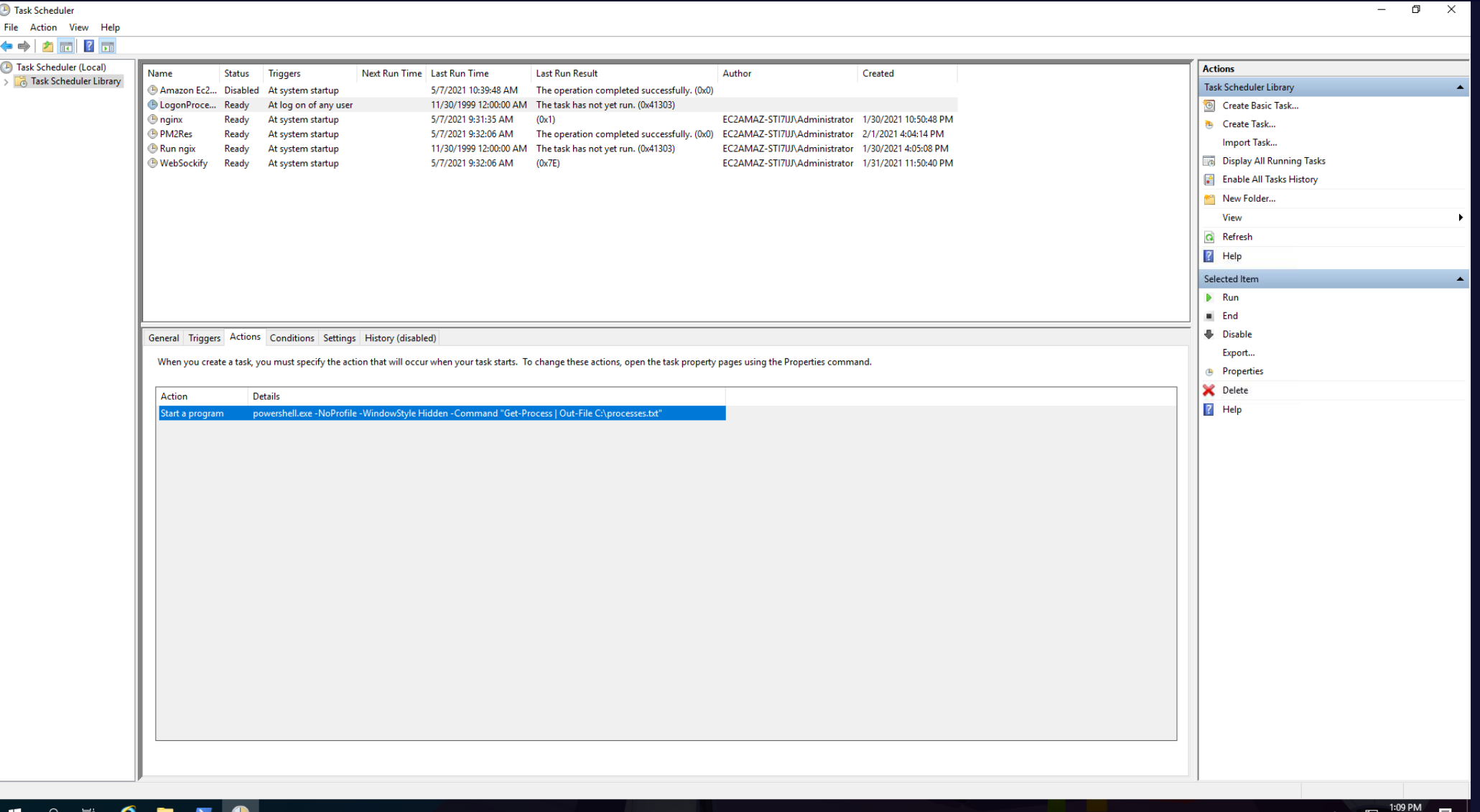 Reviewing the Task Scheduler via PowerShell surfaces a suspicious entry. The name logonprocessdump sounds process-adjacent, but the trigger and command raise immediate flags: