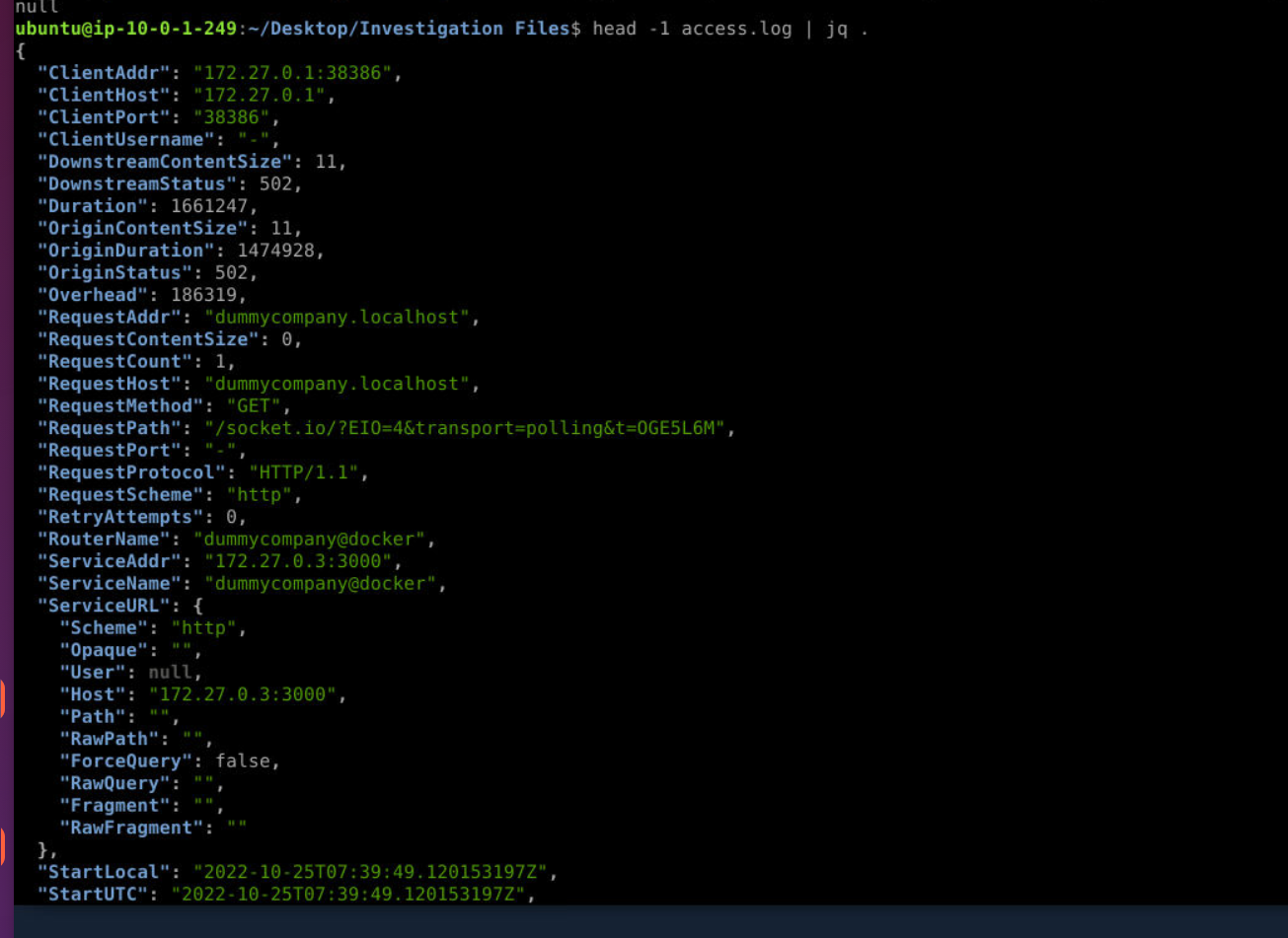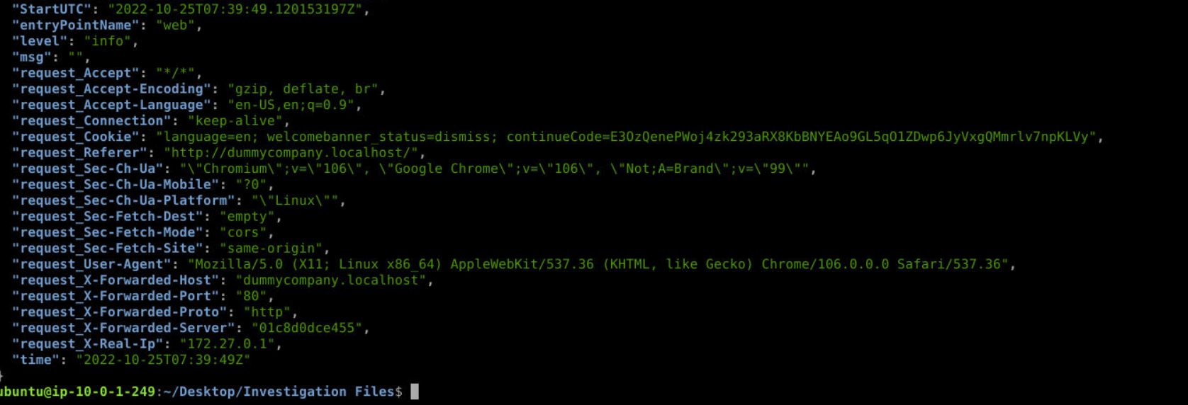 DummyCompany’s internal service dummycompany.localhost receives excessive requests from an internal IP. The Security Team suspects unauthorised access to confidential files due to an authentication/authorisation misconfiguration. A Traefik access log in JSON format is provided for analysis.