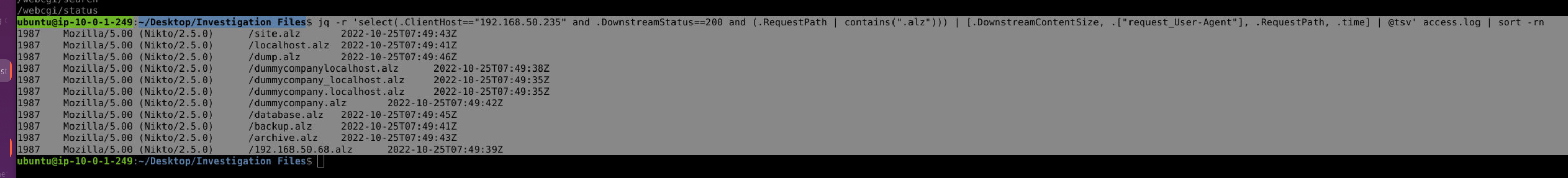 During investigation, a large volume of .alz files appeared in the 200-response list. Cross-referencing against the Nikto UA confirms these were all automated Nikto probes returning the same 1987-byte response — the server returns a consistent response body for non-existent files, making every guessed .alz path appear as a hit by byte count alone. This is a common false positive pattern in Nikto output and not indicative of real files being present.