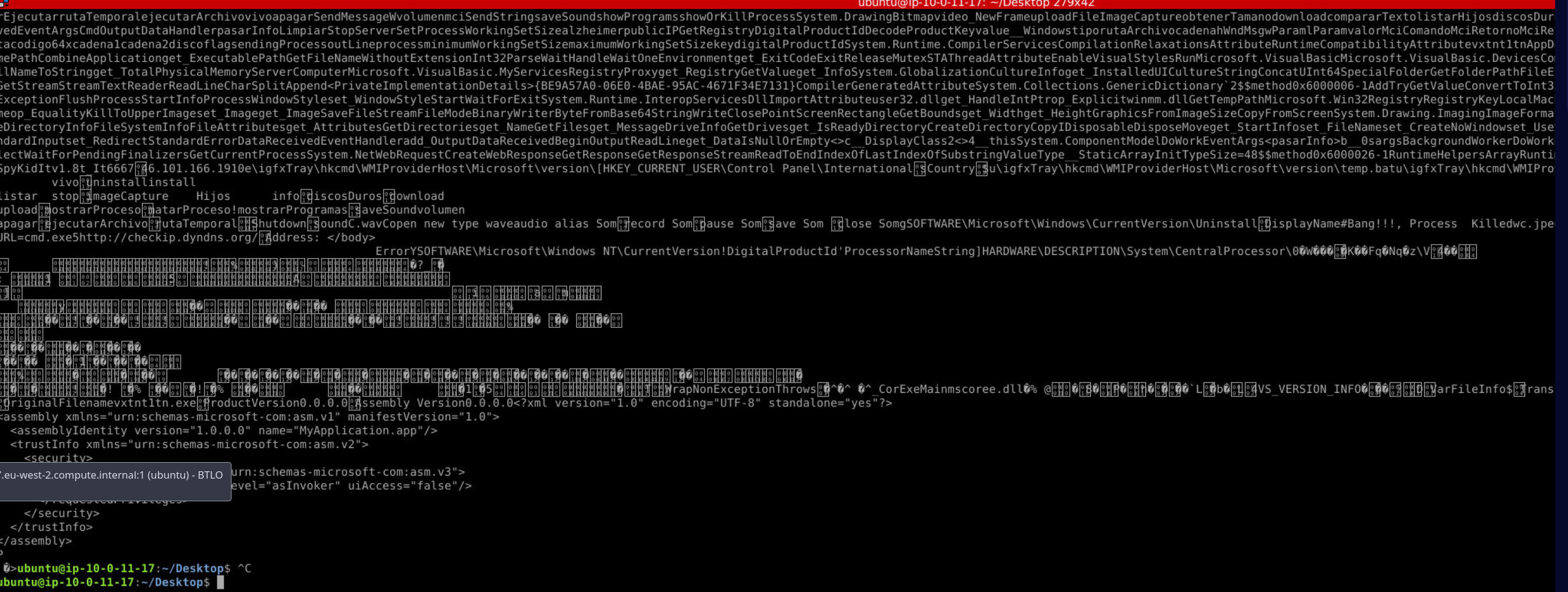 The extracted PE is a .NET assembly (mscoree.dll, MyApplication.app manifest). Standard strings is insufficient for .NET — the meaningful strings are in the metadata heap. cat on the raw binary surfaces the version info block and embedded strings: