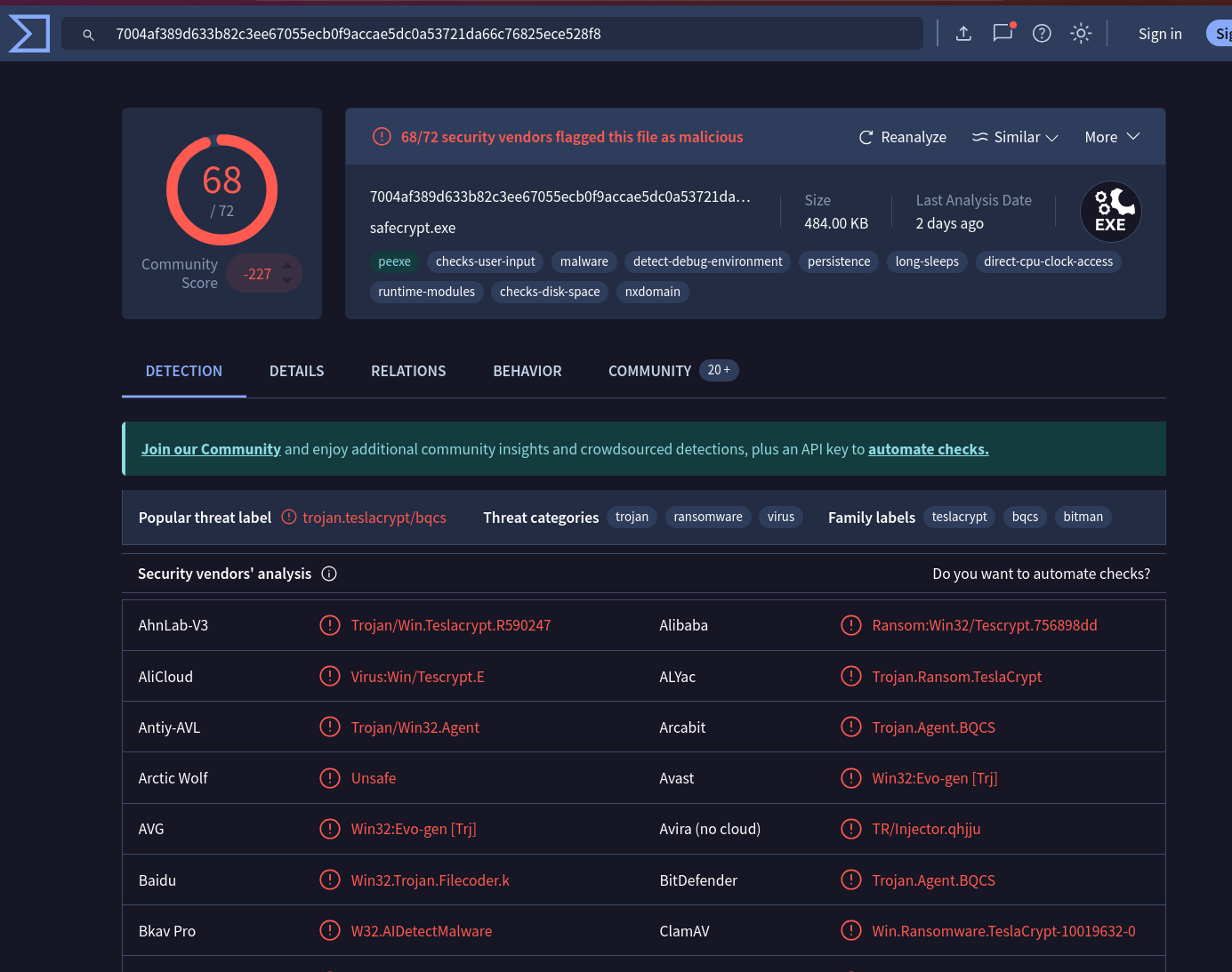 Submitting the hash to VirusTotal confirms the family — TeslaCrypt.