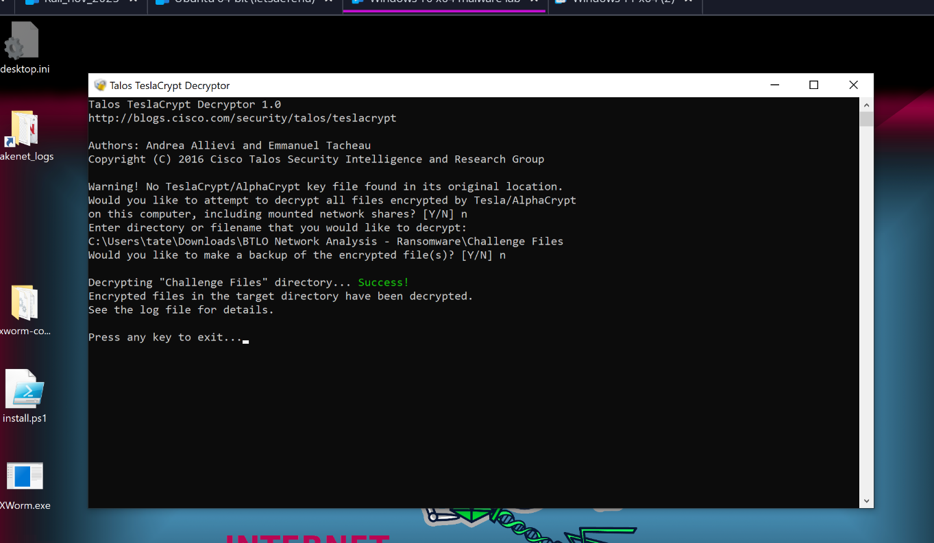The Talos TeslaCrypt Decryptor was run against the challenge directory containing Tender.pdf.micro: