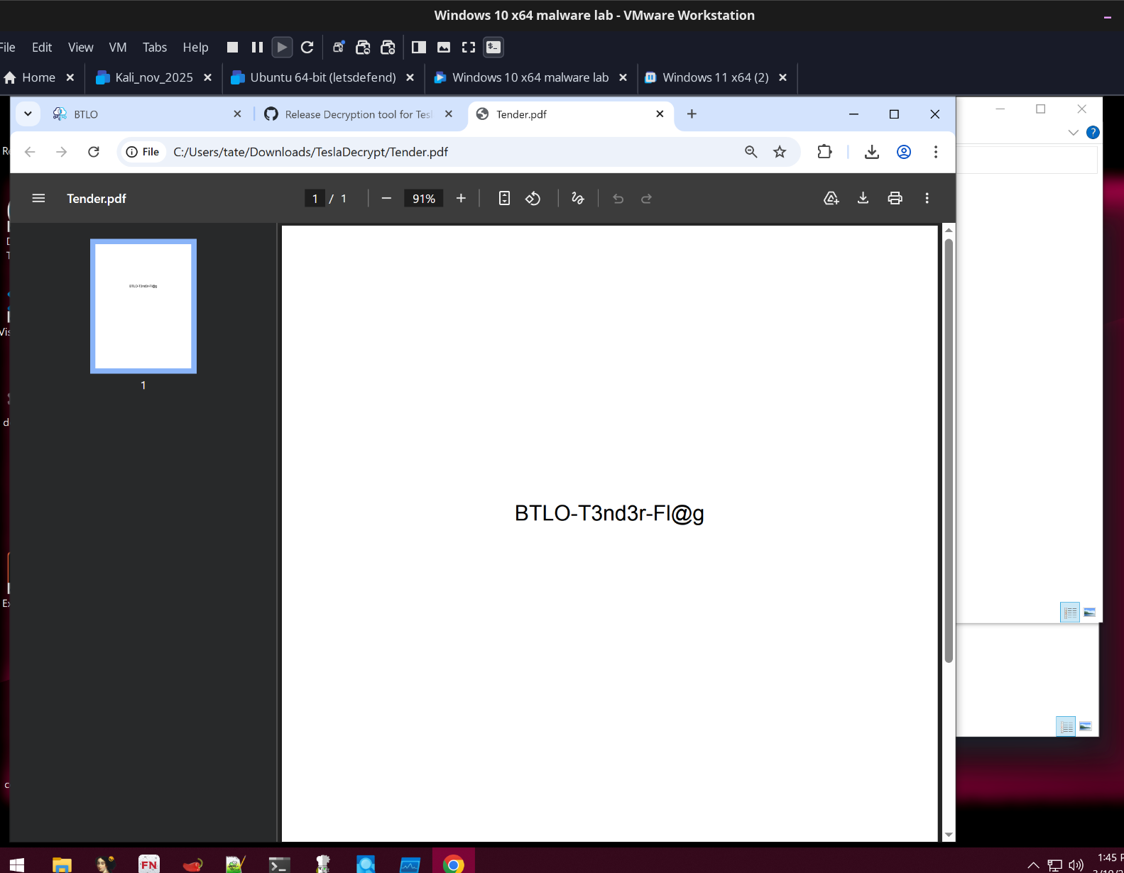 The decryptor successfully recovered the tender document, revealing the flag inside.