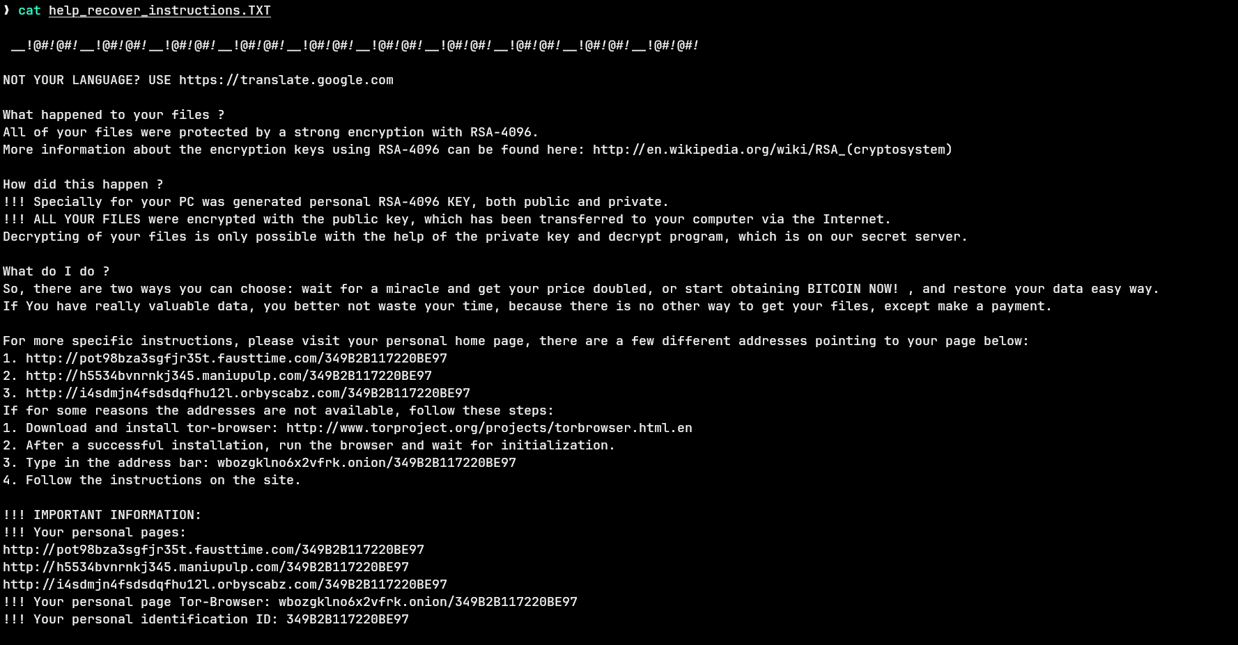 The ransom note dropped on the system claims RSA-4096 encryption and directs the victim to Tor-based payment pages with a personal ID of 349B2B117220BE97. This is standard TeslaCrypt social engineering — the RSA-4096 claim is misleading, as TeslaCrypt actually uses elliptic curve cryptography.
