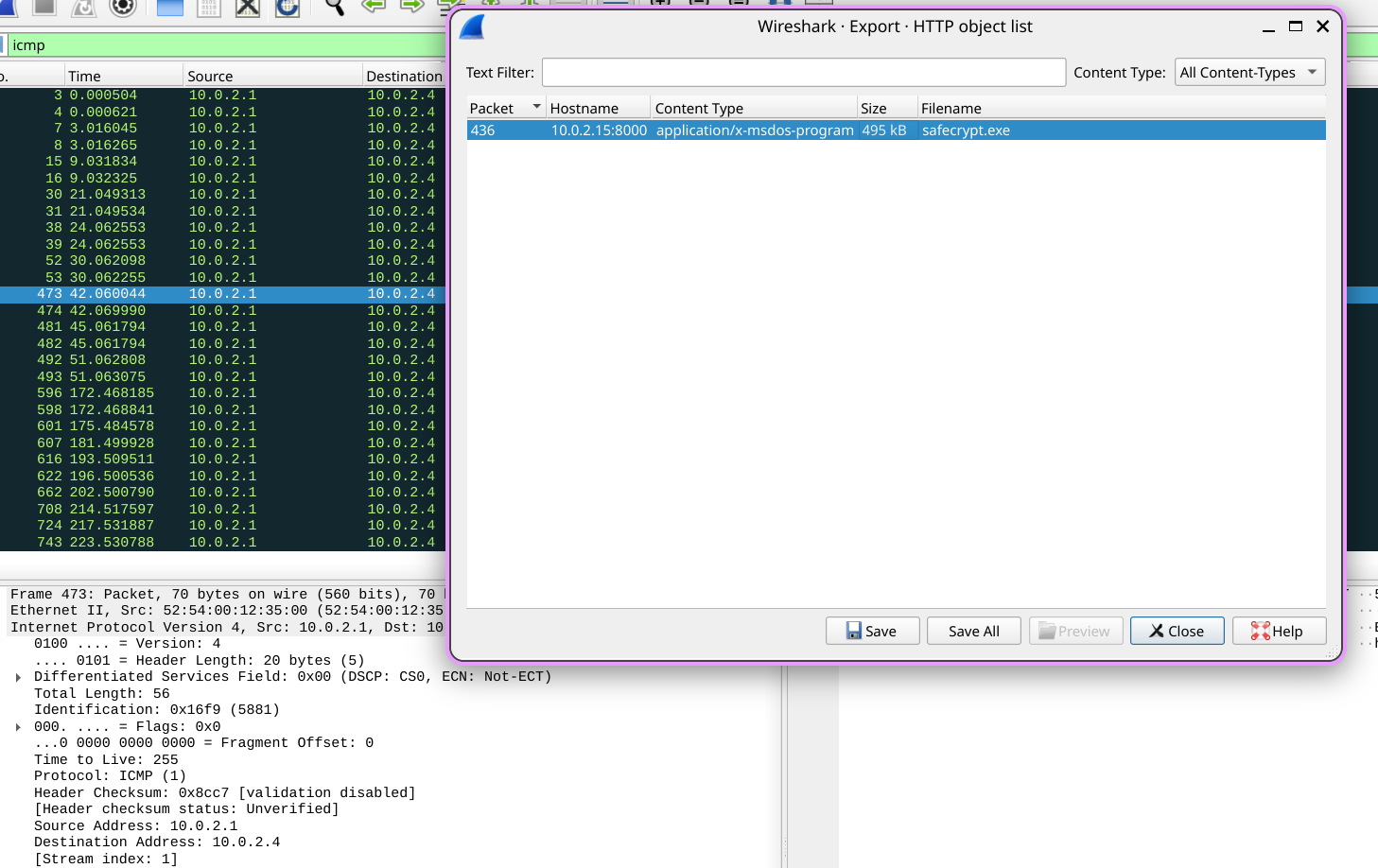 The victim at 10[.]0[.]2[.]4 pulled down an executable from an attacker-controlled HTTP server at 10[.]0[.]2[.]15:8000: