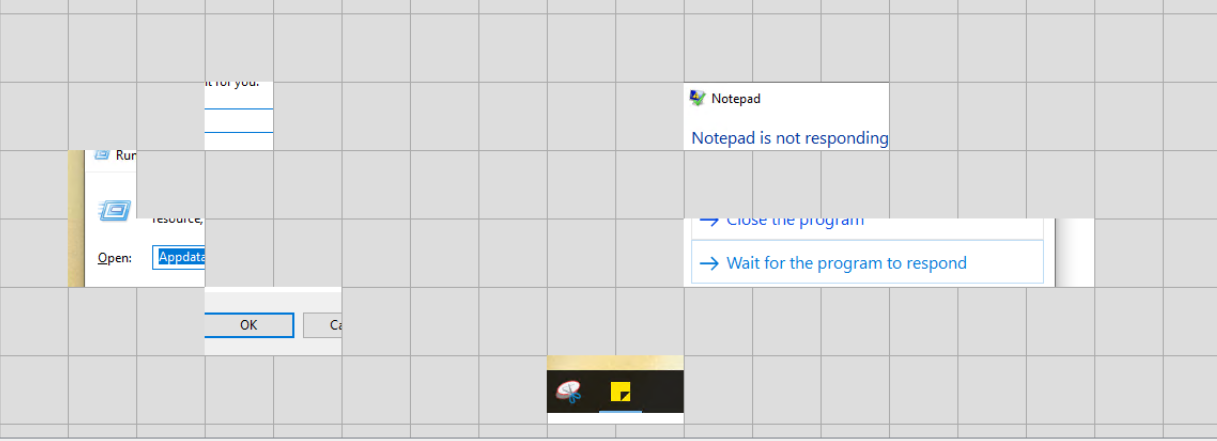 A “Notepad is not responding” error dialog and a Windows Run box with appdata entered are recovered from separate tile clusters. The yellow Sticky Notes icon is visible in the reconstructed taskbar fragment.