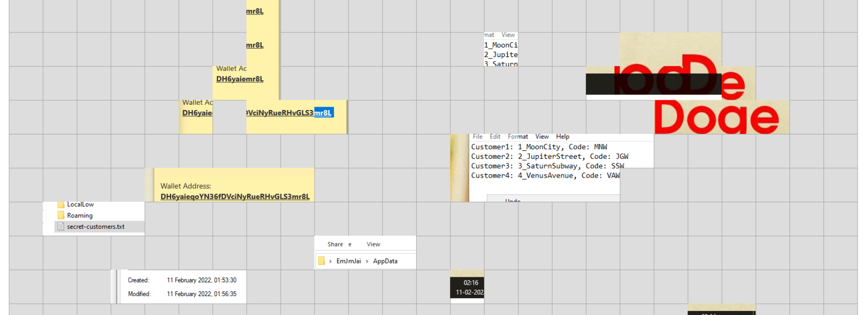 The wallet address tile is immediately identifiable — a yellow notepad background with the address string. Continuing reconstruction recovers a Notepad window containing the full customer code list, a file explorer path revealing the remote username, taskbar fragments showing the date and pinned applications, and a Windows Run dialog with the entered string.