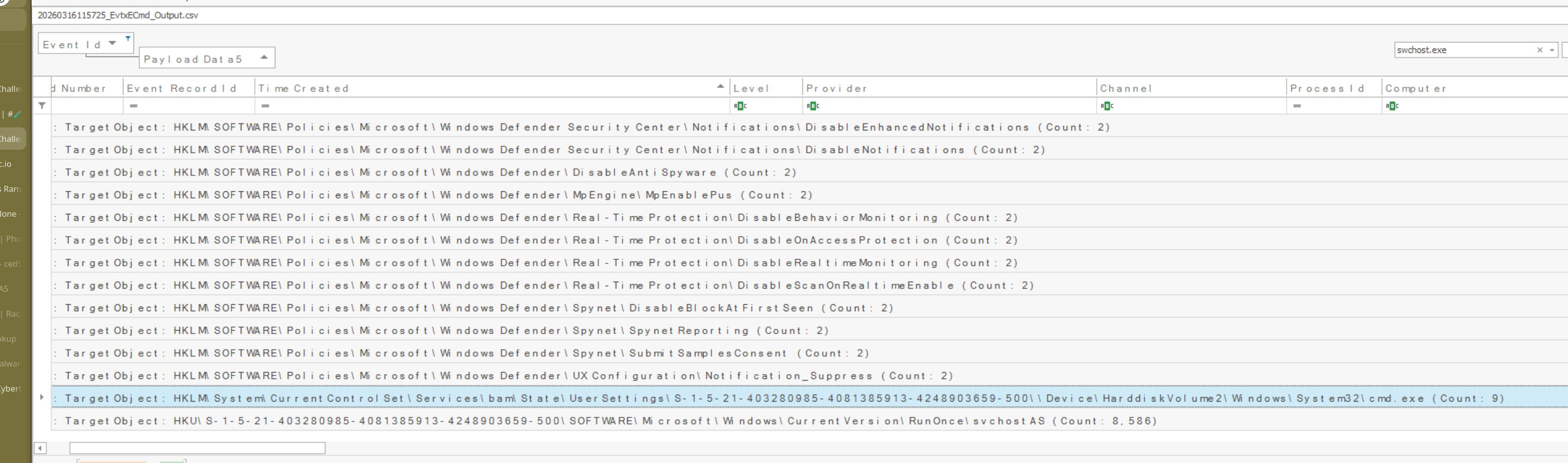Filtering Timeline Explorer CSV on Event ID 13, searching swchost, then grouping by TargetObject reveals 12 unique registry keys modified to weaken defenses: