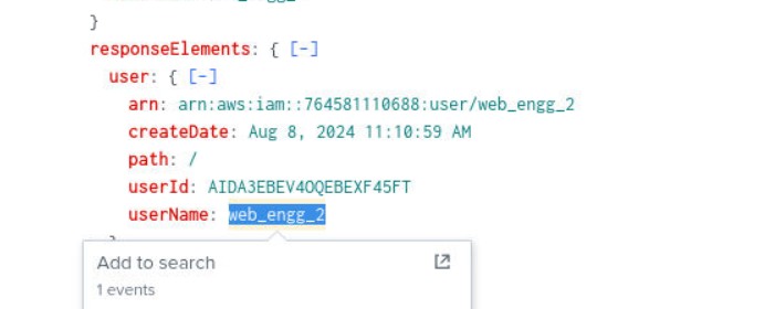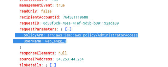 The rogue user web_engg_2 is created, blending in with what appears to be an existing naming convention for engineering accounts. The AttachUserPolicy event confirms what was granted:
