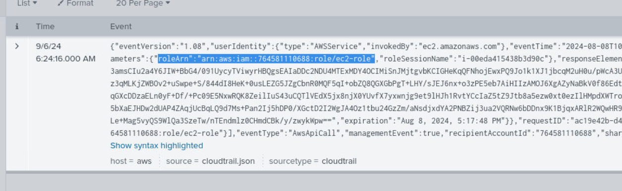 From inside the EC2 instance, the attacker enumerated the AWS environment using the instance’s attached IAM role via the Instance Metadata Service (IMDS). CloudTrail logs AssumeRole calls, but filtering these is noisy due to AWS internal services constantly assuming roles. Excluding the service noise: