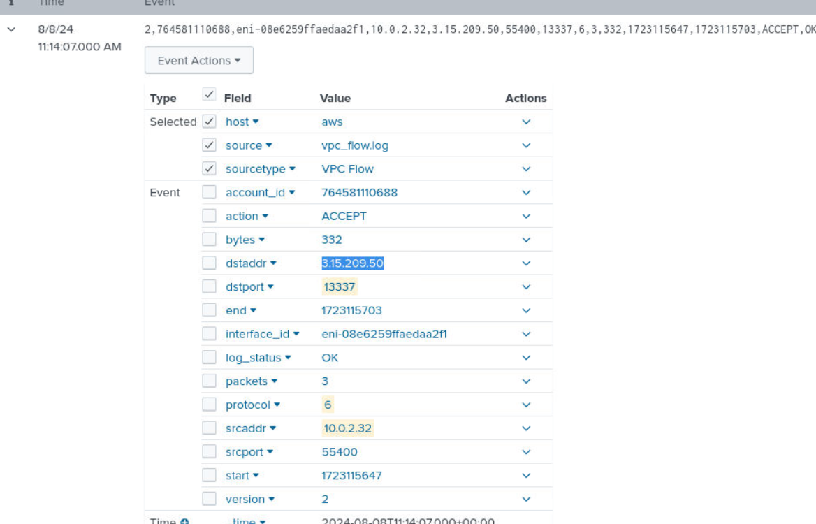 _timefield in Splunk reflects when logs were ingested into Splunk, not when events occurred. All timestamps referenced here useeventTime(CloudTrail) andstart/end(VPC Flow Logs).