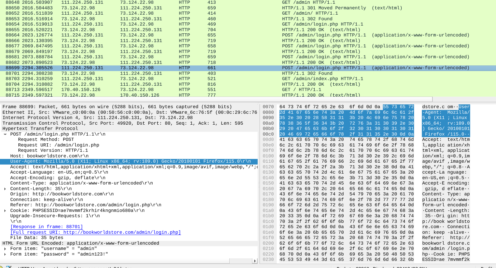 | Brute Force: Password Guessing | T1110.001 | Credential stuffing against /admin/ login — success on 5th attempt |
