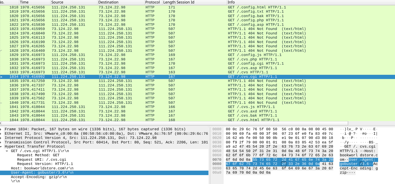 With the database mapped, the attacker pivoted to web server directory enumeration using gobuster, visible in Wireshark as a rapid burst of GET requests with the gobuster User-Agent across common directory paths: