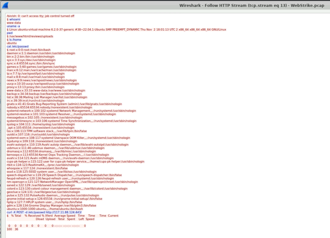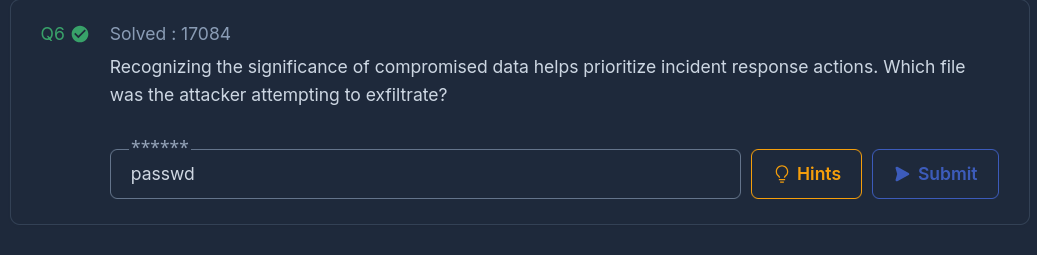The attacker attempted to exfiltrate /etc/passwd. This confirms post-exploitation activity and attempted credential harvesting.