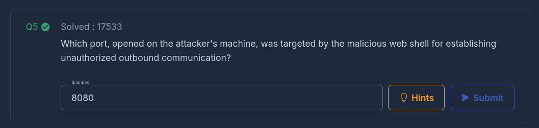 The attacker attempted to establish outbound communication to 117.11.88.124:8080. This indicates the server permitted unrestricted outbound traffic, enabling reverse shell callback. This is consistent with reverse shell behaviour.